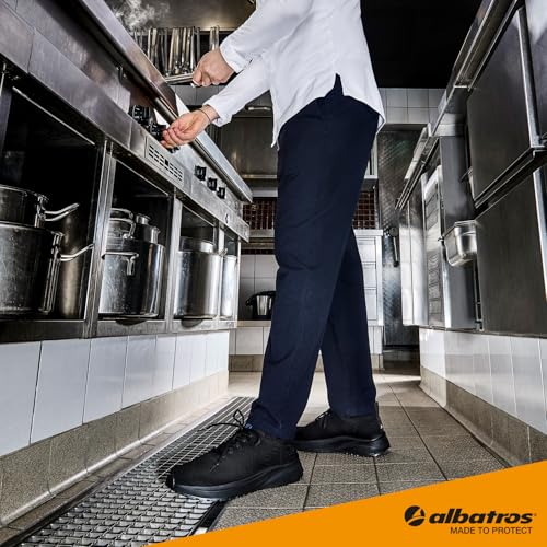 Maximale Sicherheit im hektischen Gastro-Alltag trifft auf Leichtigkeit: Der ALBATROS Mood Rutschhemmende Serviceschuhe ist der ideale Non-Slip Sneaker für Damen und Herren in Gastronomie, Hotellerie und Catering. Das innovative Stollenmuster mit 360° Grip-Technologie leitet Flüssigkeiten zuverlässig ab und sorgt auch auf nassen oder fettigen Böden für festen Halt. Die GRIPPAZ Transaction-Laufsohlentechnologie bietet Halt in jeder Situation, damit Sie sich voll auf Ihre Arbeit konzentrieren können. Das spritzwassergeschützte Obermaterial macht den Schuh robust und pflegeleicht – perfekt für den Einsatz im Service und in der Küche. Ein modernes, zeitloses Design kombiniert mit ergonomischer Dämpfung, die Füße und Gelenke schont und ermüdungsfreies Arbeiten unterstützt. Ob im Service, Hotelbetrieb oder Catering – dieser Schuh begleitet Sie zuverlässig durch jeden Arbeitstag und sorgt für Sicherheit, Komfort und Stil.