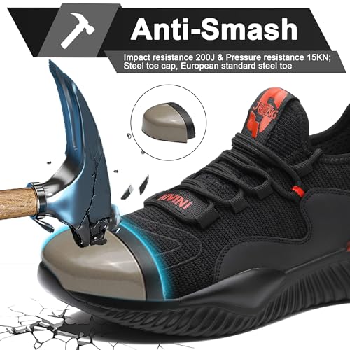 Arbeitsschuhe Damen Herren Leicht Stahlkappenschuhe Damen Safety Shoes Women Arbeitsschuhe Küche Damen Arbeits Berufsschuhe Hallenschuhe Damen Schuhe Schwarz Rot 39EU bieten sicheren Komfort für jeden Arbeitstag. Die Stahlkappe entspricht EU-Normen und schützt die Zehen zuverlässig vor schweren Gegenständen, wobei sie einer Aufprallkraft von 200 J standhält. Zusätzlich sorgt eine pannensichere Kevlar-Zwischensohle dafür, dass Durchtrittsicherheit gegen Nägel, Bewehrungsstäbe und scharfe Gegenstände besteht. Die hochwertige Innensohle mit durchdachtem Rahmendesign reduziert die Fußreibung und sorgt auch bei langen Einsätzen für angenehmen Halt. Eine strapazierfähige Gummisohle mit rutschfestem Profil erhöht die Sicherheit auf nassen oder unebenen Arbeitsflächen. Vielseitig einsetzbar sind diese Sicherheitsschuhe ideal für Baustellen, Autoreparaturen, Lager, Werkstätten, Gärten, Küchen und den täglichen Gebrauch im Innen- wie Außenbereich. Dank leichter Materialien bieten sie hervorragenden Tragekomfort, Bewegungsfreiheit und lange Haltbarkeit – perfekt für Damen und Herren, die Wert auf sicheren, komfortablen Alltagsschuh legen.