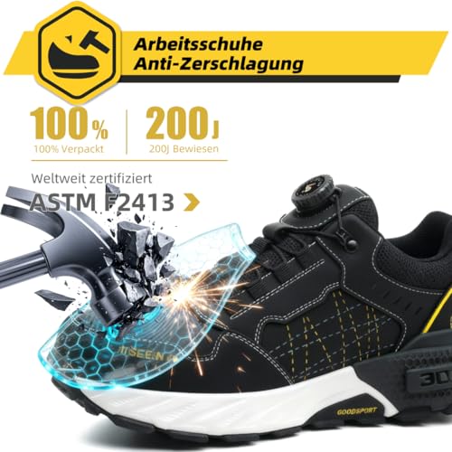 Arbeitsschuhe für Herren mit Stahlkappe, Leichte atmungsaktive & unzerstörbare, Clickers und pannensicherer, Rutschfester Sohle – Sicherheitsschuhe für Beruf und BAU Black-44