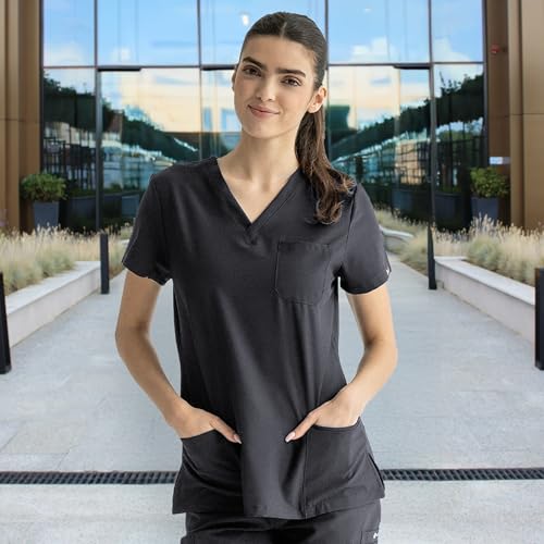 BELLA Damen-Schrubb-Set in Grau aus 94% Polyester und 6% Elastan bietet elastischen Komfort, Bewegungsfreiheit und praktische Taschen – ideal für medizinisches Fachpersonal, das Wert auf Stil und Funktion legt.
