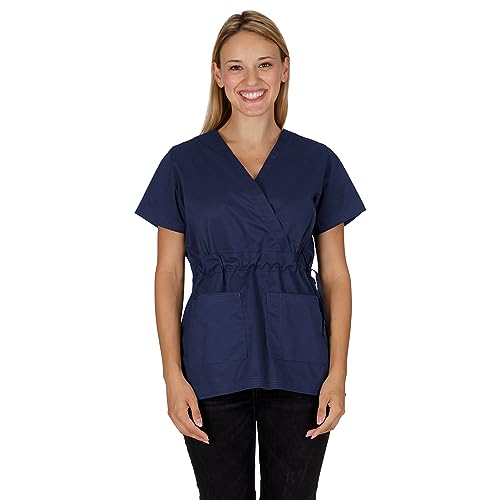 Damen-Kasack aus strapazierfähigem Polyester-Baumwoll-Mischgewebe mit Elasthan, zwei Taschen, Wickeldesign, V-Ausschnitt und verstellbarem Taillenkordelzug. Pflegeleicht und langlebig für Kosmetik, Spa und medizinische Bereiche.