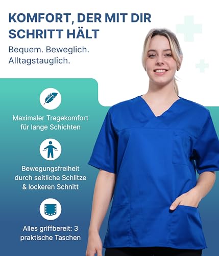Der beb™ Schlupfkasack Kornblau Unisex vereint hohen Tragekomfort mit praktischem Funktionsumfang – perfekt für Pflegeberufe in Klinik, Praxis und Betreuung. Der bequeme Schnitt mit V-Ausschnitt und Seitenschlitzen ermöglicht optimale Bewegungsfreiheit den ganzen Tag über, egal in welchem Bereich Sie tätig sind. Das robuste Mischgewebe aus 65% Polyester und 35% Baumwolle ist pflegeleicht, bügelleicht und langlebig. Dank Maschinenwaschbarkeit bis 60 °C, Autoklavierbarkeit sowie glatter Oberfläche bietet der Kasack beste Hygienewerte und eine einfache Pflege im Alltag. Zwei großzügige Seitentaschen und eine Brusttasche sorgen dafür, dass Stifte, Schlüssel oder Telefon schnell griffbereit sind. Die unifarben Kornblau-Optik wirkt professionell und zeitlos, ideal für Damen und Herren – Unisex-Fit inklusive. Der Kasack überzeugt durch hochwertige Verarbeitung, ohne Faserflusen, bleibt formstabil und behält den Look auch nach vielen Waschgängen. Überzeugen Sie sich selbst von einem zuverlässigen Begleiter im Klinik- oder Pflegeteam – mit dem bequemen Schlupfkasack gewinnen Sie Komfort, Funktion und Stil in einem.