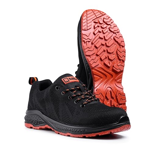 BLACK HAMMER Sicherheitsschuhe für Herren: Leichtgewichtige, atmungsaktive Schuhe mit Stahlkappe und rutschfester S1P-Sohle. Diese Berufsschuhe vereinen Komfort, Haltbarkeit und Schutz – ideal für Arbeit, Wandern oder industrielle Einsatzbereiche. Dank der leichten Flyknit-Technologie bietet der Schuh eine angenehme Passform, die Bewegungsfreiheit ermöglicht, ohne Kompromisse bei der Sicherheit. Die ÖL- und rutschfesten Sohlen mit antistatischen Absätzen reduzieren das Risiko von Ausrutschern und helfen, den Arbeitsalltag sicher zu meistern. Entwickelt und designed in Großbritannien, mit EU- und UK-Registrierung, perfekt geeignet für breite Einsatzfelder und lange Tragezeiten.
