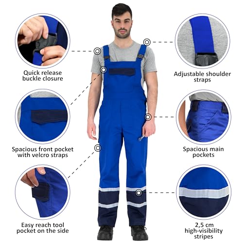 BWOLF Char Latzhose Herren Arbeitshose Schutz-Latzhose Herren mit Reflektierenden Elementen – Blau/Grau (Blau, M)