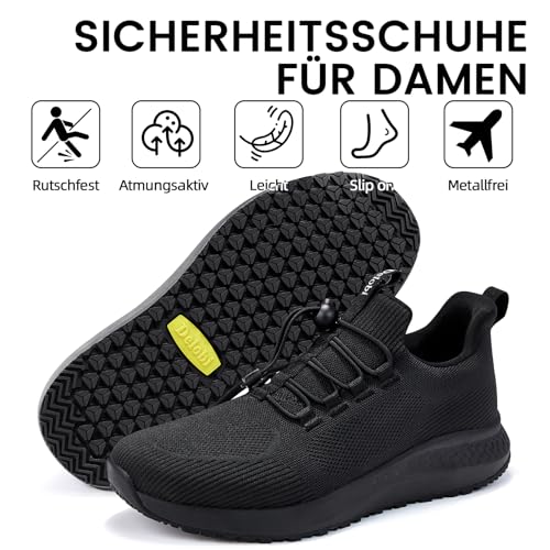 Delobi Damen Kochschuhe – rutschfest Atmungsaktiv Arbeitschuhe, Leichte Sicherheitsschuhe für Gastronomie, Krankenhaus & Pflege, Schockabsorbierend mit Langanhaltender Bequemlichkeit, Schwarz 37.5