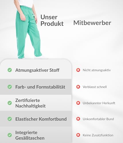 Dieckhoff® OP-Hose Unisex – Bequem mit Gummizug und Gesäßtasche – die ideale Pflege-Berufsbekleidung für lange Einsätze im medizinischen Alltag. Diese Hose verbindet komfortable Passform mit praktischem Design und überzeugt durch Strapazierfähigkeit sowie einfache Pflege. Der elastische Bund sorgt für eine flexible Passform über den gesamten Arbeitstag hinweg, egal ob im Krankenhaus, in der Praxis oder in der Tierarztpraxis. Die aufgesetzte Gesäßtasche bietet Platz für kleine Utensilien und erleichtert den Arbeitsalltag, während der neutrale Look optisch überzeugt und sich nahtlos in verschiedene Uniformen integrieren lässt. Dank der sorgfältig gewählten Materialzusammensetzung bleibt die Hose formstabil und farbecht – auch nach häufigem Waschen. Die ökologische Herstellung mit dem Grünen Knopf belegt transparente Sozial- und Umweltstandards entlang der Lieferkette. Verfügbar in einer breiten Größenauswahl und ideal geeignet für Damen und Herren, die Wert auf Komfort, Funktionalität und eine gepflegte Optik legen.