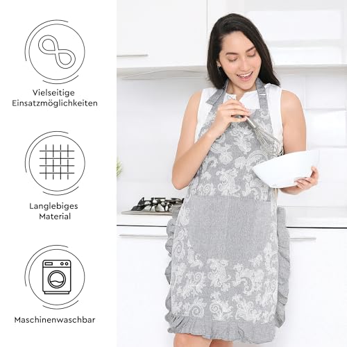 Encasa XO Schürze für Frauen | Baumwolle Chambray Stoff mit Blumen-Rüschen | Küchenschürze Kochschürze mit 2 großen Taschen | Stylischer Schutz – 70×85 cm – Grau