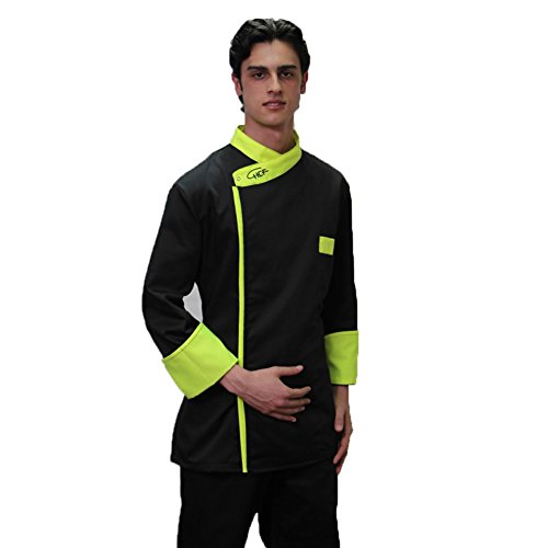 Moderne Neon-Kochjacke mit sicherem Clip-Verschluss, leichtem Tragekomfort durch 65/35 Polyester-Baumwolle, schmutzabweisend und bügelfrei – ideal für professionelle Küchenalltag.