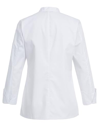 Professionelle Damen-Kochjacke im Regular Fit mit tailliertem Schnitt, Wiener Nähten und Lüftungslöchern. Pflegeleichtes, atmungsaktives Gewebe mit verdeckter Druckknopfleiste und praktischer Armtasche.