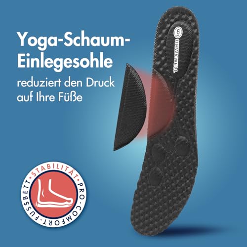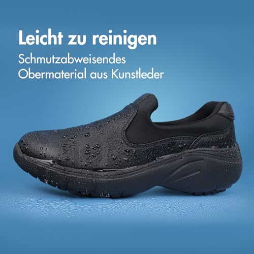 Hawkwell Damen-Schlupfschuhe: Leichte Pflegeschuhe, die Komfort, Stil und Sicherheit im Arbeitsalltag vereinen. Der elastische Kragen umschließt den Fuß sanft und dehnt sich bei jedem Schritt, was ultimativen Flexibilität und einfaches An- und Ausziehen ermöglicht. Die schmutzabweisende Obermaterial-Oberfläche sorgt dafür, dass Sie den ganzen Tag gepflegt aussehen – ideal für anspruchsvolle Branchen und lange Schichten. Ein Innenleben mit Yoga-Schaum-Fußbett bietet 12 Stunden Support und angenehmen Halt, während die rutschfeste Außensohle auf nassen und trockenen Untergründen Stabilität garantiert. Die leichte EVA-Unterseite reduziert das Gewicht, damit Sie auch lange Steh- und Gehzeiten mühelos bewältigen. Mit dem 3,8 cm hohen Absatz erhalten Sie eine schmeichelhafte Silhouette und eine funktionale Auftriebshilfe, ohne Kompromisse bei der Bewegungsfreiheit einzugehen. Der sportliche Slip-On-Stil und die Sneaker-inspirierte Form machen diesen Schuh nicht nur zum perfekten Arbeits- sondern auch zum vielseitigen Freizeitbegleiter. Ob im Büro, in der Werkstatt oder beim Kundenkontakt – dieser Schuh unterstützt Sie zuverlässig mit Komfort, Haltbarkeit und einer unkomplizierten Pflege. Farbe: Schwarz, Größe EU 41.