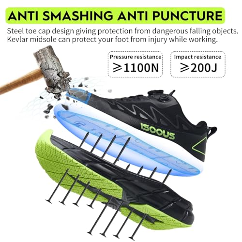 ISOOUS Sicherheitsschuhe Herren S3S Wasserdicht Arbeitsschuhe Damen ESD Leicht Drehverschluss rutschfest Bequem mit Stahlkappe Schwarz Grün 45 EU