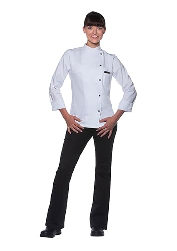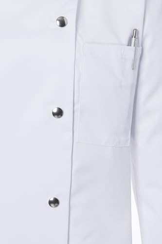 Karlowsky Damenkochjacke Larissa mit Stehkragen aus Polyester/Baumwollmix, weiß, Größe 38. Pflegeleicht, schickes Design und ideale Passform für professionelle Küchen.