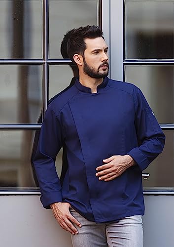 Kochjacke Noah Marine, Größe 50: leichtes Köpergewebe, schlanke Silhouette, verdeckte Knopfleiste, Schlaufe für Latzschürze, 50/50 Polyester/Baumwolle.
