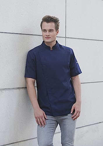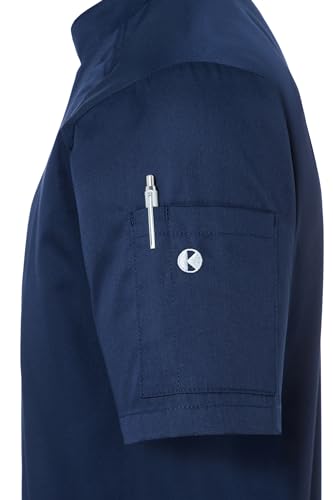 Karlowsky Kurzarm Kochjacke Modern-Look Marine – leicht, pflegeleicht und stilvoll. Ideal für warme Küchen, mit verdeckter Knopfleiste, Schlaufe für Latzschürze und StiftsTicket.
