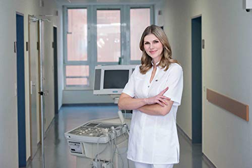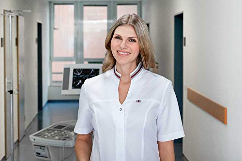 Farbiges Zierband am Kragen und der linken Brustseite sowie 11 praktische Taschen – ideal für Medizin- und Pflegeberufe. Bequeme Seitenschlitze erhöhen den Tragekomfort.