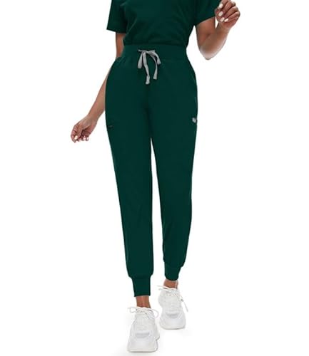 Größen: XS (EU 36) bis 3XL (EU 48). Funktionales medizinisches Scheuer-Set mit 8 Taschen, 4-Wege-Stretch, antimikrobiell, feuchtigkeitsableitend, knitterarm. Großer Taschensatz, V-Ausschnitt, Jogger-Hose. Hunter green. Von Medskin entworfen.