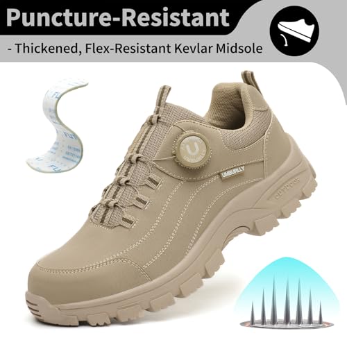 EU-zertifizierte Stahlkappe + Kevlar-Schutz, rutschfeste, atmungsaktive Arbeitsschuhe mit Schnellverstell-Dialsystem – ideal für Bau, Werkstatt und Lager.