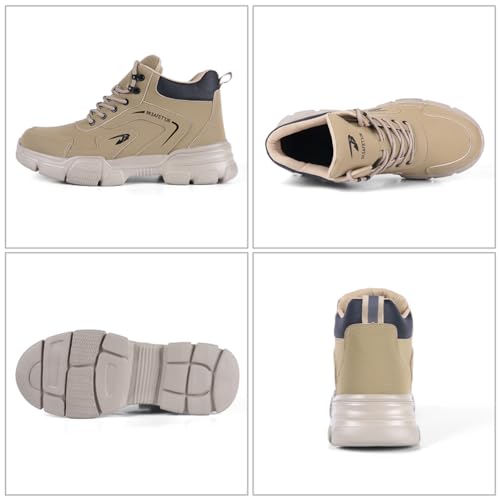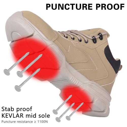 OFFCUP Sicherheitsschuhe Herren Damen, Wasserdicht Stahlkappe Arbeitsschuhe, Schnittschutzstiefel, Rutschfeste Leicht Knöchelhoch Leder Sicherheitsschuhe Khaki Größe 42