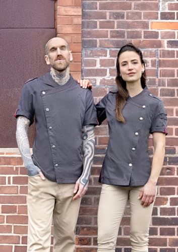 Rockige Denim-Optik, pflegeleicht, kurze Ärmel. Die ROCK CHEF Damenkochjacke überzeugt mit schlanker Silhouette, praktischen Druckknöpfen und robustem Polyester/Baumwollmix – OEKO-TEX zertifiziert, Größe 42.