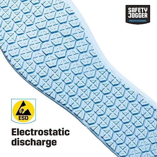SAFETY JOGGER Arbeitsschuhe Clogs Damen von CARINNE – Pflegeclogs, Berufsschuhe Clogs EU 40, Blau – vereinen Schutz, Komfort und Vielseitigkeit im Arbeitsalltag. Die Schuhe verbessern das Feuchtigkeits- und Temperaturmanagement und bieten so noch angenehmeren Tragekomfort auch über längere Einsätze. Die integrierte ESD-Funktion sorgt für eine kontrollierte Ableitung elektrostatischer Energie und vermindert Zündgefahren durch Aufladungen, mit einem Durchgangswiderstand zwischen 100 Kiloohm und 100 Megaohm. Die Gummilaufsohlen mit Oxytraction-Technologie gewährleisten hervorragende Traktion auf trockenen und nassen Böden und erfüllen die SRC-Normen (SRA+ SRB). Für individuellen Komfort lassen sich Engeleinlagen regelmäßig wechseln oder eigene orthopädische Einlagen verwenden. Die robuste Gummilaufsohle bietet zusätzlich Schnittfestigkeit, Hitze- und Kältebeständigkeit sowie Flexibilität bei niedrigen Temperaturen und ist beständig gegen Öl, Kraftstoffe und Chemikalien – ideal für abwechslungsreiche Arbeitsbereiche.