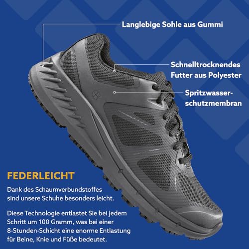 Shoes for Crews Endurance II Men – Berufsschuhe mit federleichtem Tragekomfort, flexibler rutschhemmender Sohle und Spritzwasserschutz. Ideal für lange Schichten in Gastronomie, Logistik, Facility Management und Gesundheitswesen. Das atmungsaktive Mesh-Meh abschirmt den Fuß zuverlässig und sorgt für ein angenehmes Fußklima über den ganzen Tag. Die flexible Laufsohle passt sich jeder Bewegung an und bietet sichere Traktion auf glatten oder verschmutzten Oberflächen. Voll vegan und metallfrei, somit robust und langlebig – Gewicht pro Schuh ca. 285 Gramm (in Größe 42). Die gepolsterte Innensohle ist herausnehmbar und das Netzmaterial mit Schutzmembran schützt vor Spritzwasser, ohne die Atmungsaktivität zu beeinträchtigen. Perfekt kombinierbar mit langen Arbeitszeiten, in der Küche, Kurierdiensten, Gebäudereinigung oder im Gesundheitsbereich.