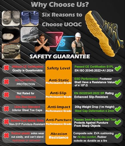 UOQC S1 Sicherheitsschuhe Herren ESD Antistatisch SR rutschfest Arbeitsschuhe Damen Stahlkappenschuhe Leicht Atmungsaktiv Komfortabel in Breiter Passform für Industrie & Gewerbe Schwarz 42EU
