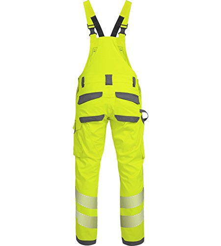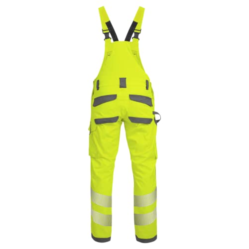 Warnschutz-Latzhose von WÜRTH MODYF in Neon Gelb/Anthrazit mit 5 Außentaschen, Hammer-, Handy- und Zollstockhalter. Vorgeformte Knie, OEKO TEX, schwer entflammbar, schnelltrocknend. Reflektorstreifen für erhöhte Sichtbarkeit.