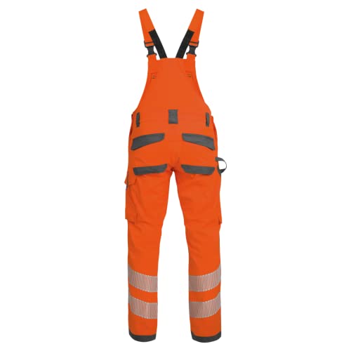 Warnschutz-Latzhose mit 5 Außentaschen, Hammer-, Handy- und Zollstockhalter. Vorgeformte Knie, OEKO TEX zertifiziert, schwer entflammbar und schnelltrocknend. Loxy Reflektorstreifen für bessere Sichtbarkeit.
