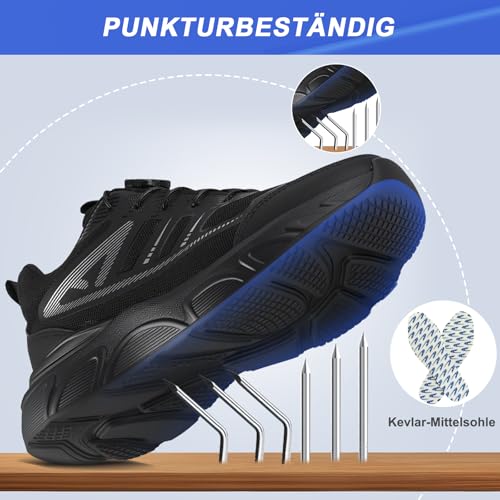 Sicherheitsschuhe Herren mit einhändig bedienbaren Drehverschlüssen für schnelles An- und Ausziehen. Stoßdämpfende EVA-Sohle, rutschfeste Gummi-Laufsohle, Stahlkappe und kevlarverstärkte Zwischensohle schützen Füße zuverlässig – bequem und atmungsaktiv.